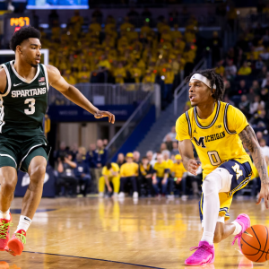 FIRST HALF: 3:54: Michigan 28, Michigan State 23 Tre Holloman halted the 15-0 run with a pair of free throws and a jumper for Michigan State’s first made basket in…