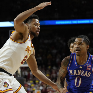 Men’s Basketball Kansas guard Shakeel Moore (0) drives past Iowa State forward Joshua Jefferson during the first half of an NCAA college basketball game, Wednesday, Jan. 15, 2025, in Ames,…