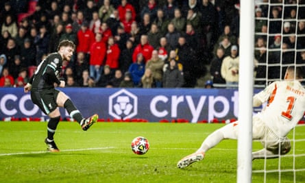 Liverpool soon regained the lead when Gakpo turned Wataru Endo’s ball into the path of Chiesa, whose low drive was parried into the path of Harvey Elliott by Walter Benítez. The midfielder, who scored the winner against Lille last week, made no mistake from close range.
