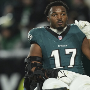 Eagles linebacker Nakobe Dean leaves on crutches after injuring his left knee against the Packers