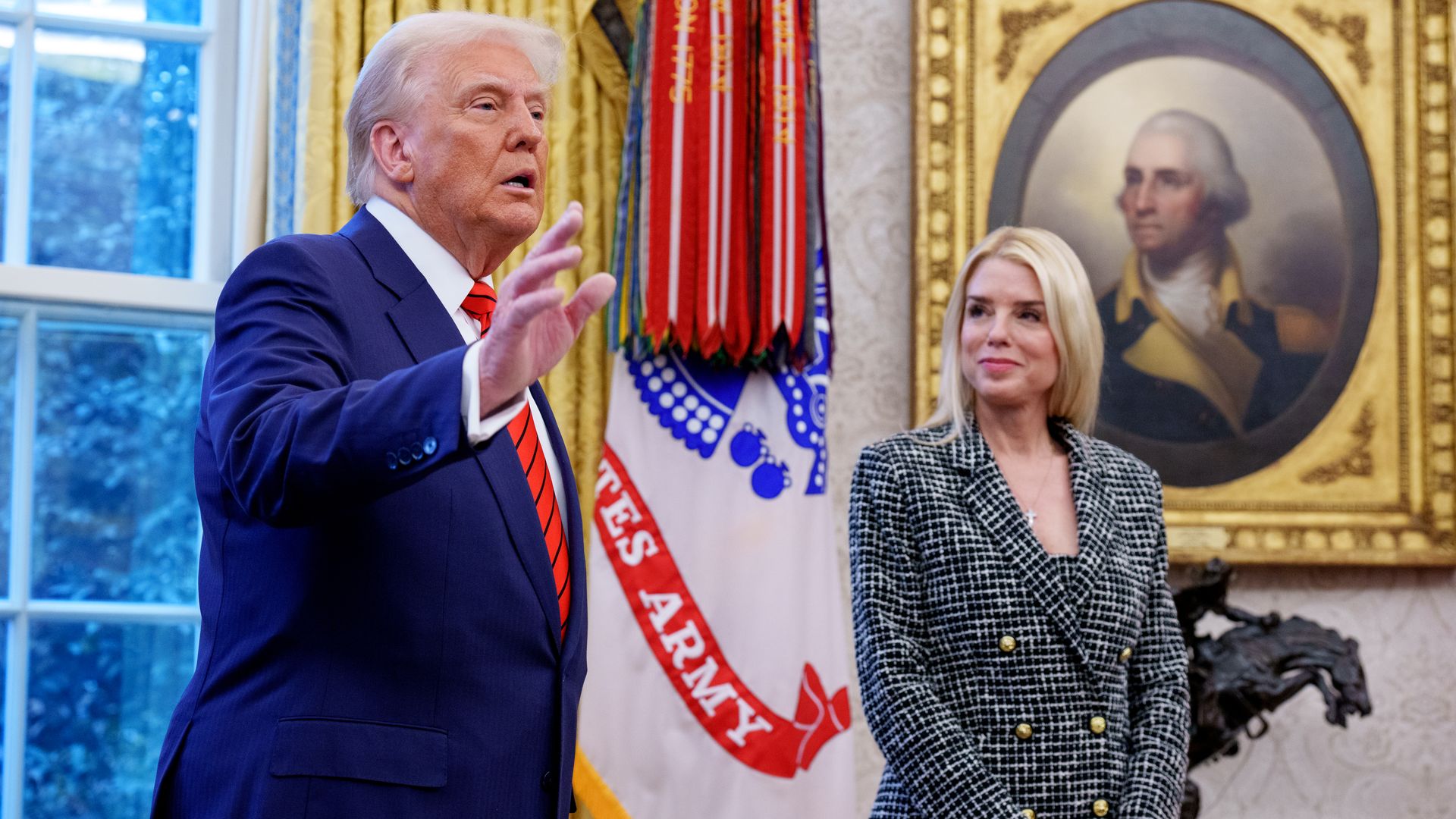 President Trump, accompanied by newly sworn-in U.S. Attorney General Pam Bondi at the White House on Feb. 5 in Washington, DC. Photo: Andrew Harnik/Getty Images